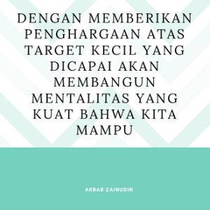 Itupun berlaku untuk target yang ingin diraih. Target besar harus dipecah menjadi target-target kecil untuk mudah dicapai, target kecil inilah yang akan membuat diri terlihat mampu dan akan menjadikan mampu untuk meraih target yang besar.