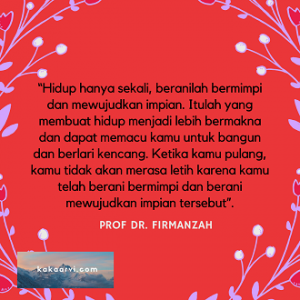 Ada satu pelajaran berharga dari moto hidup seorang yang bernama Prof. Firmanzah (dekan termuda di UI). Motonya kurang lebih seperti ini, “Hidup di dunia hanya sekali maka wujudkanlah impian”.